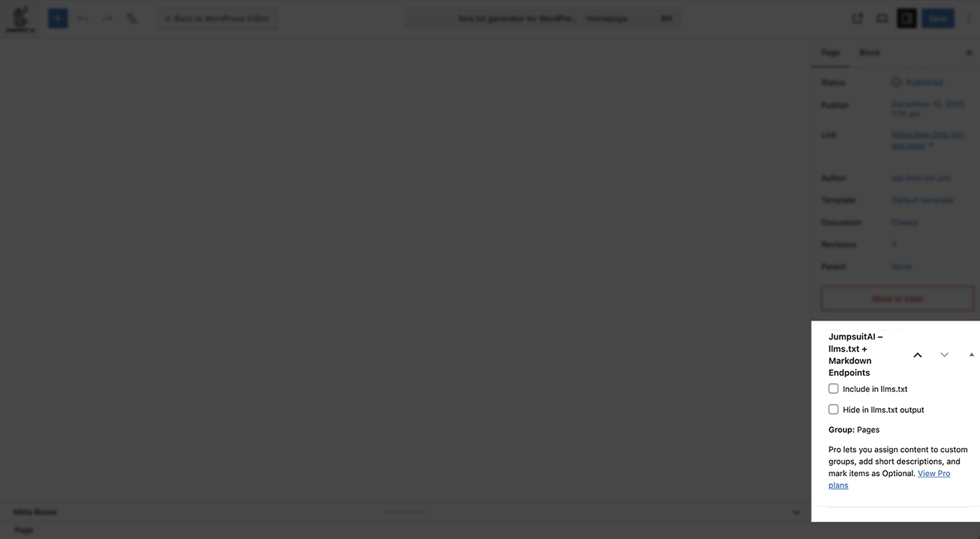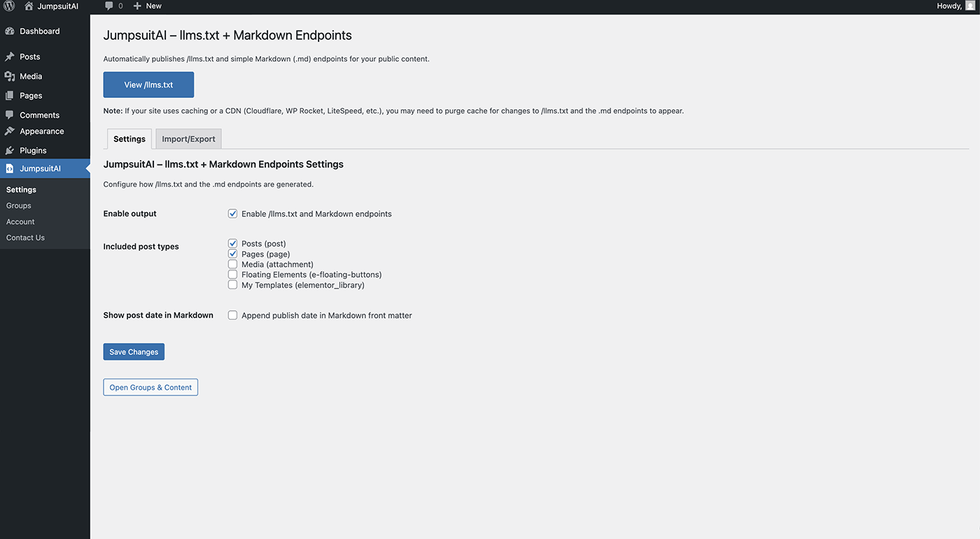 It also includes a simple Groups & Content screen to keep your output organized with sensible defaults (Pages and Posts), plus per-item controls like Hide from LLMs.